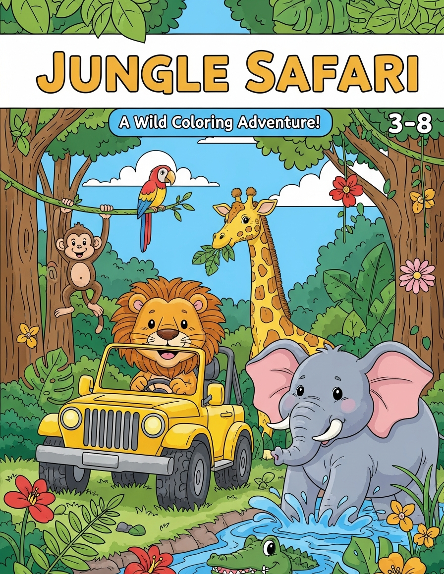 Dive into the wild with this 110-page Jungle Safari Coloring Book, packed with lions, elephants, tigers, giraffes, zebras, monkeys, birds, reptiles, and many more exciting jungle animals!